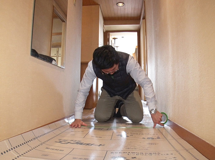 家財や床や壁などに傷がつかないように、材料や職人さんの通り道に養生をします。