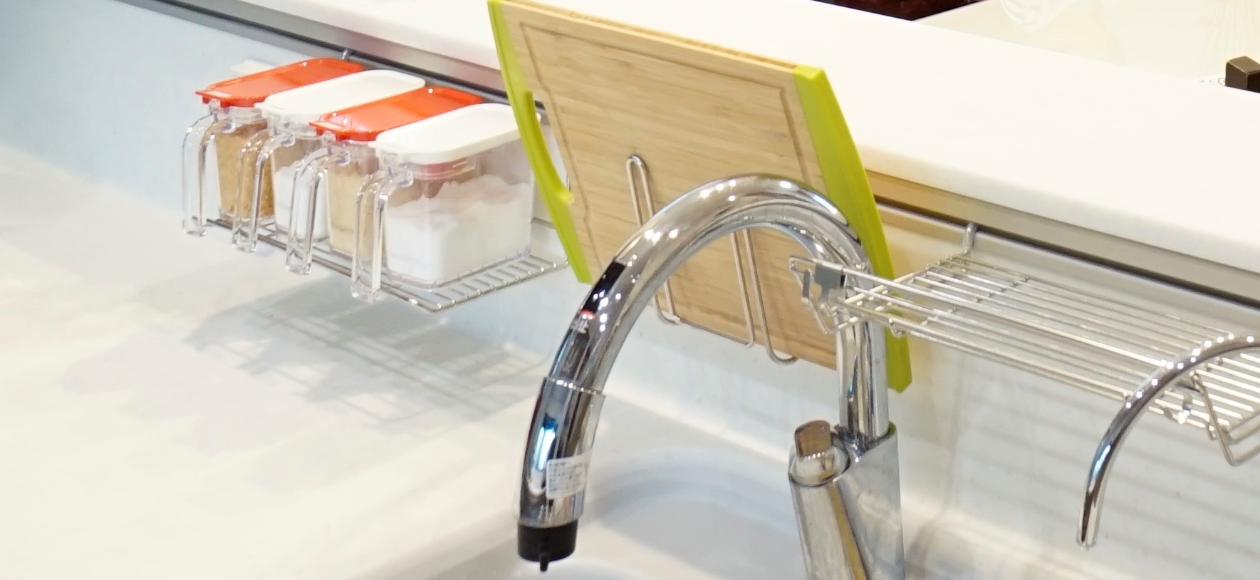 調理器具を直置きせずに、ハンガーアイテムで浮かせておくことで、調理スペースは広々と使用することができお掃除もスムーズに。
