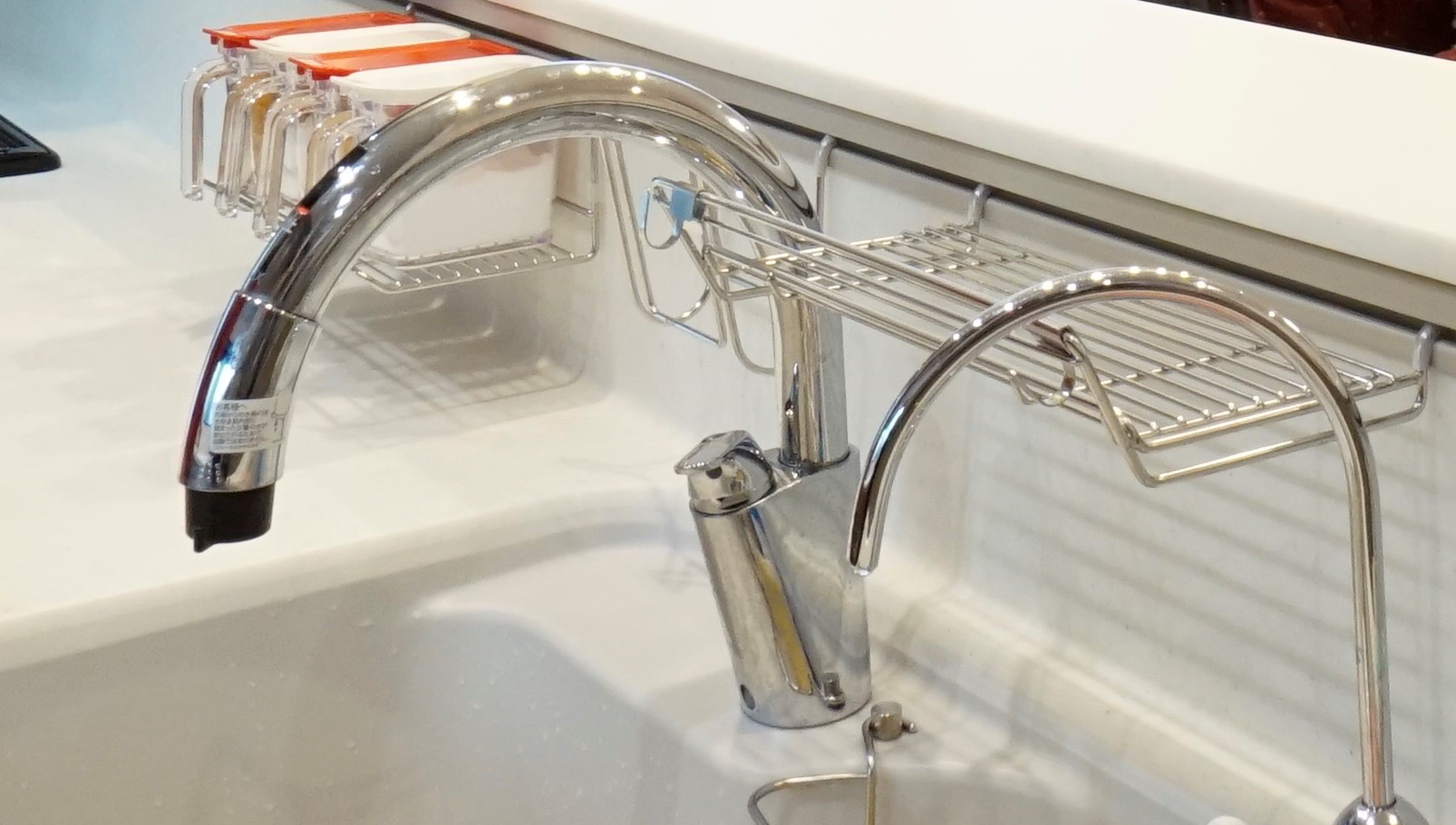 現在流通しているキッチンのほとんどが、次の写真のように水栓後ろ部分の立ち上がり部分が短くなっています。