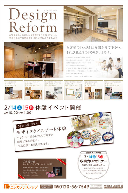 2015.02.10 2/14・15 日進スタジオで手作りタイルアート体験イベント開催! イベントは終了いたしました。 ご来場いただいた皆様に厚く御礼申し上げます。 いろんな自然素材を体感するイベントを開催! 今回はモザイクタイルアート体験!! コースターやペンホルダーなど、様々な形の素材にタイルを貼り、オリジナルの作品を作ることができます。 当ショールームにてたくさんの種類のタイル・素材をご用意いたしますので、ご来店は手ぶらでOK! 出来上がった作品は後日お送り致します。 また、外壁・外構・洗面台・トイレ・LDKでアクセントなどにタイルを使った施工事例もご用意しております。 是非、お気軽に遊びに来てください! 各チラシはクリックすると大きなサイズで確認できます。