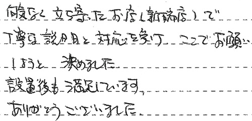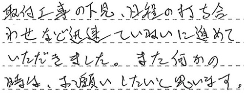 取付工事の下見、日程の打ち合わせなど迅速ていねいに進めていただきました。また何かの時はお願いしたいと思います。