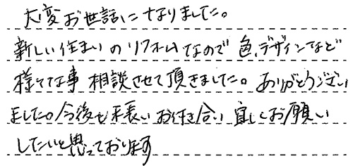 新しい住まいのリフォームなので色、デザインなど様々な事相談させて頂きました。ありがとうございました。今後も末長いお付き合い宜しくお願いしたいと思っております。