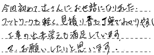 フットワークも軽く、見積り書も丁寧でわかりやすく工事の出来栄えも満足しています。