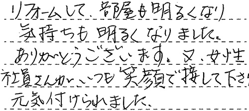 ありがとうございます。又、女性社員さんがいつも笑顔で接して下さり元気付けられました。