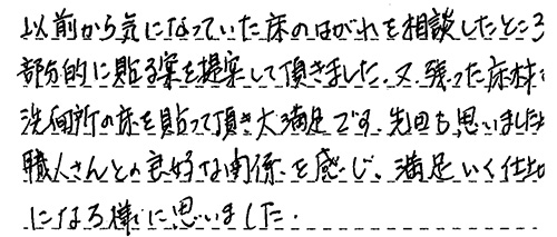 以前から気になっていた床のはがれを相談したところ部分的に貼る案を提案して頂きました。又、残った床材は洗面所の床を貼って頂き大満足です。先日も思いましたが職人さんとの良好な関係を感じ、満足のいく仕上りになる様に思いました。