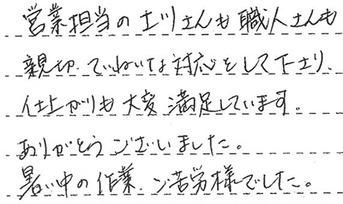 営業担当の森様も工事の段取りも、工事職人さんも、大変親切に接して頂いて、有難とうございました。又よろしくお願いします。