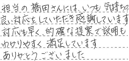 担当の橋田さんには、いつも気持ちの良い対応をしていただき感謝しています。対応も早く、的確な提案で説明もわかりやすく満足しています。ありがとうございました。