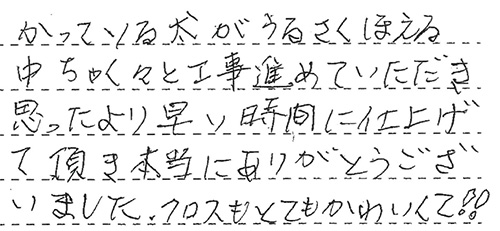 かっている犬がうるさくほえる中ちゃく々と工事進めていただき思ったより早い時間に仕上げて頂き本当にありがとうございました。クロスもとてもかわいくて‼