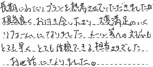 長期にわたりプランを熟考させていただきましたが根気良くお付き合い下さり、大変満足のいくリフォームになりました。メール等への対応もとても早くとても信頼できる担当さまでした。
