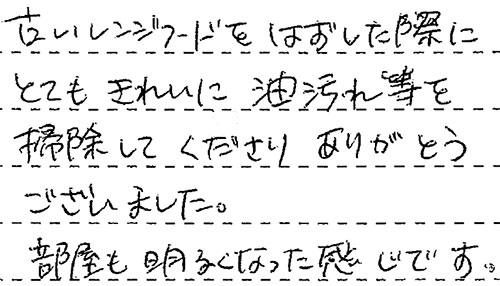 古いレンジフードをはずした際にとてもきれいに油汚れ等を掃除してくださりありがとうございました。