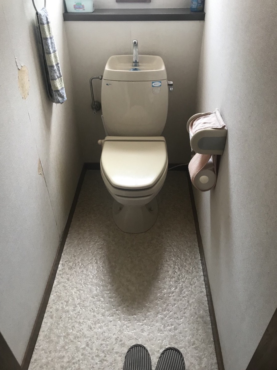 もともと背面の設備壁で少し狭かったトイレは、壁を取り払うことで空間を広く確保しました。お施主様お気に入りの泡洗浄機能付きPanasonicアラウーノを、自動水栓の手洗いカウンターとセットで採用し、快適で使いやすいトイレにリフォームしました。