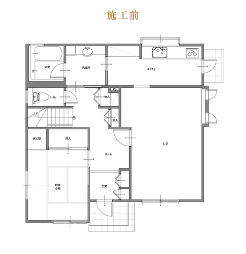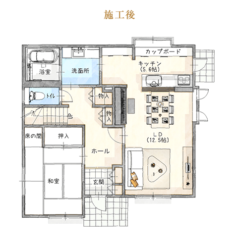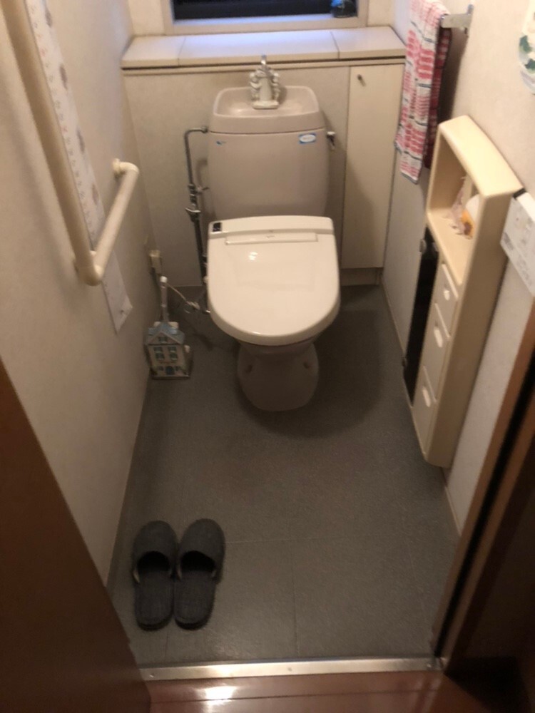 お手洗いを快適に使えるよう、もともとあった設備壁を活かして収納スペースを設けました。さらに、携帯置きや手すりを取り付けることで、日々の使いやすさを高めた便利で心地よいトイレ空間に仕上げています。