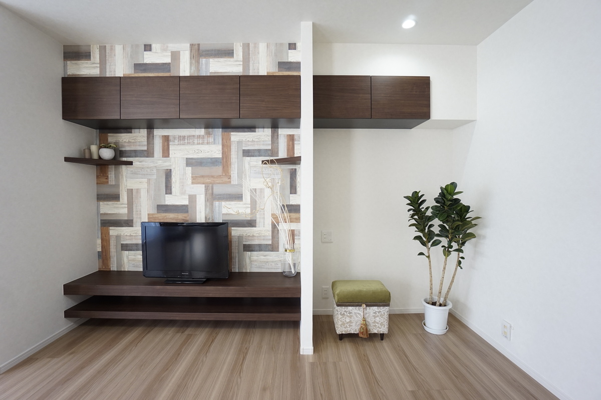 和室を洋室に変えてキッチンとつなげ、広々としたLDに。抜けない筋交いは腰壁とクロスで目立たないよう工夫し、扉付き収納も2か所に設置しました。床はペット対応のフローリングを採用し、ペットの毛が目立ちにくい色を選択。さらに配線も吊戸に収納して、すっきりとした空間になりました。