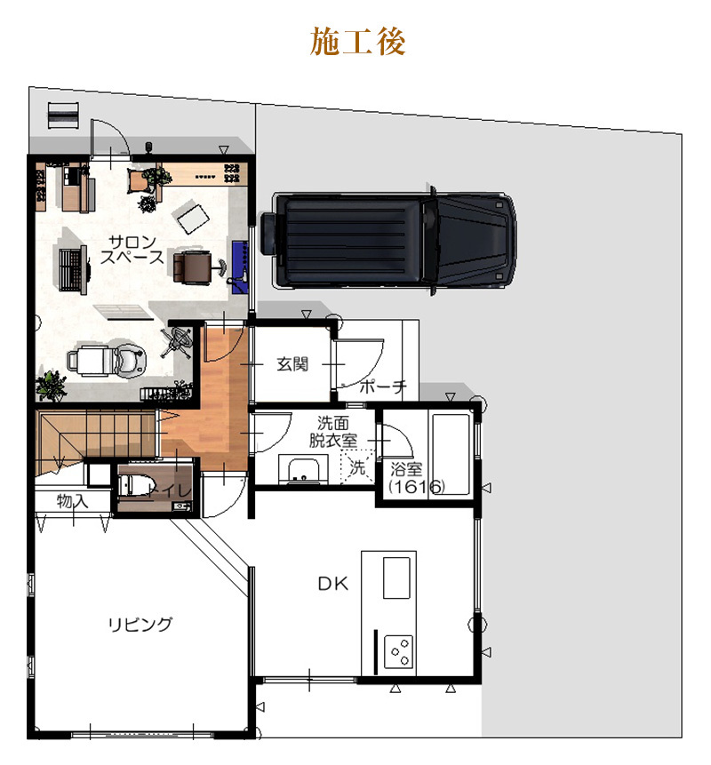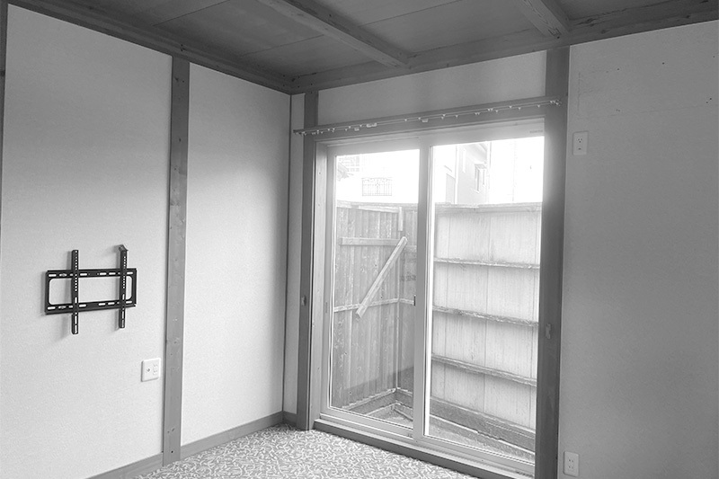 購入した物件の寝室を活用し、美容室へとリノベーションしました。シャンプー台やカットスペースは使いやすさを重視して配置し、施術がしやすい導線を確保。店舗の「顔」となる玄関ドアは木製を採用し、取っ手にはアイアン調の金物を合わせました。外観はジョリパットで仕上げ、雨の日に備えてひさしも設置。さらに、駐車スペースを確保するため入口を東側から北側へ変更し、フェンスを撤去して外からの視認性も高めました。こうして、プライベート感を守りながらも入りやすい雰囲気のサロンが完成しました。