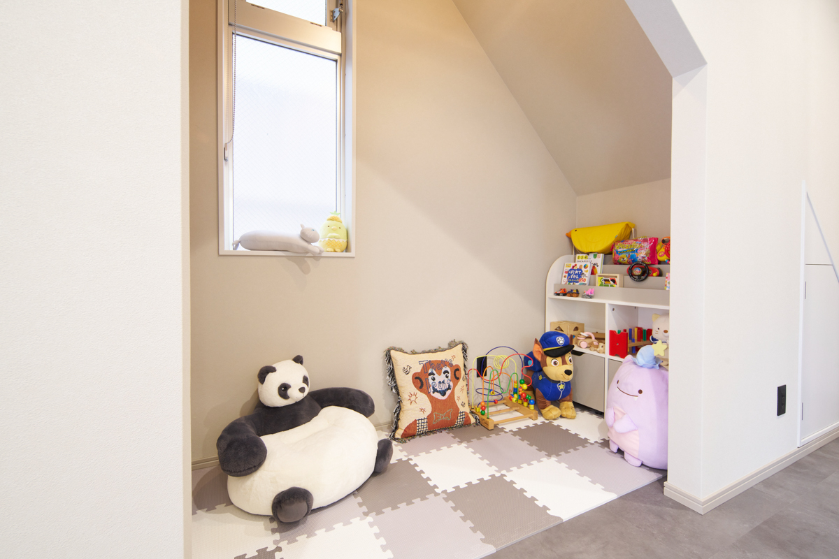 施工はカットスペース・シャンプースペース・キッズスペース・トイレの4箇所です。店内はナチュラルを基調に、ゴールドの上品さとパールグレーの柔らかさを加え、温かみと落ち着きのある空間に仕上げました。カットスペースは大きな鏡を並べ、ご家族でも過ごしやすいよう配慮。シャンプースペースはカーテンで仕切り、快適さとプライベート感を確保しました。階段下は収納を活用し、アール壁の入口を設けたキッズスペースに。トイレもサロン全体の雰囲気に合わせて仕上げました。