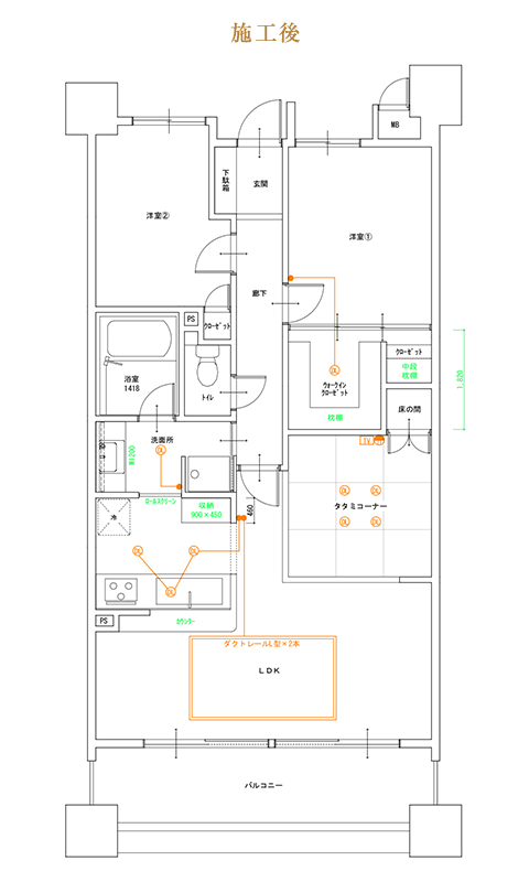 白を基調にした内装で、照明の反射により空間全体がより明るく広々と感じられるようになりました。天井にはダクトレールを設け、スポットライトやペンダントライトを自由に配置可能に。交換済みの畳は再利用し、LDKと一続きにして開放感を確保しました。仏壇スペースには「ラシッサS」の建具を採用し、洋風長押をピクチャーレールとして使えるよう工夫しています。
