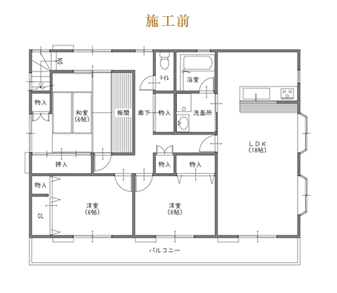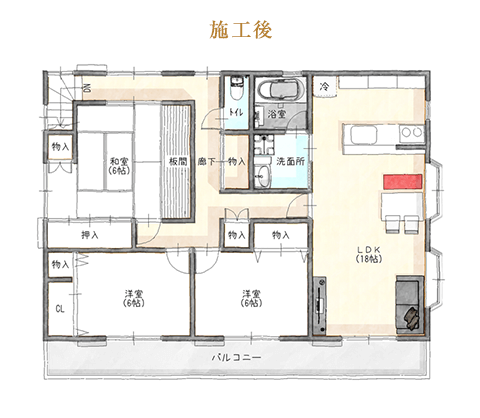 吊り戸の圧迫感やカウンターの散らかりやすさを解消するため、思い切って撤去。LDKは広々とした印象になり、対面式収納でダイニング側にも使いやすい収納を確保しました。さらに耐力壁を活かしたレイアウトと照明計画で、明るくすっきりとした住み心地のよい空間に仕上げています。