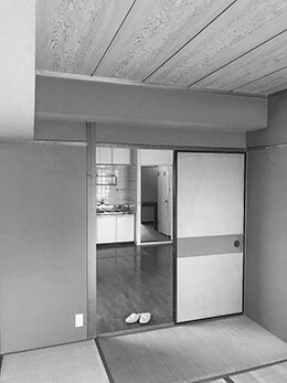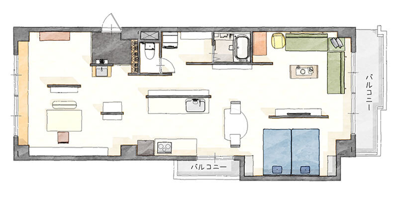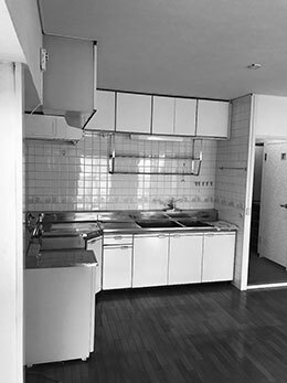 間仕切りを減らし壁を薄くすることで、奥行きと抜け感のある開放的なLDKを実現しました。キャビネットや天板を組み合わせたオリジナルキッチンは、自由なサイズ設計とシンプルな構成でコストを抑えつつ理想のデザインに。レンジフードも既存の換気口に合わせて工夫し、すっきりと納めています。