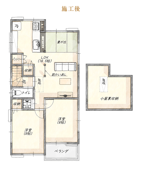 もとの納戸をリビングダイニングへつなげ、広々とした空間に変えました。柱や壁の位置を工夫し、できる限り開放感を確保しています。収納を兼ねた小上がりの畳を設け、腰掛けや家族のくつろぎスペースとして活用可能に。将来はベッドとしても使えるよう取り付け方を工夫し、長く快適に過ごせる空間となりました。