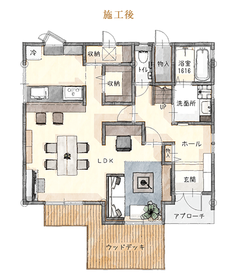 リビングダイニングはホテルロビーのような落ち着いた空間に仕上げ、ダークトーンの内装と間接照明で大人の雰囲気を演出。キッチンは通路幅1.3mを確保し、収納量を増やしながら使いやすい動線を実現しました。手元を隠せる対面カウンターは軽食スペースとしても活用でき、背面にはガラスタイルを施工して高級感をプラスしています。