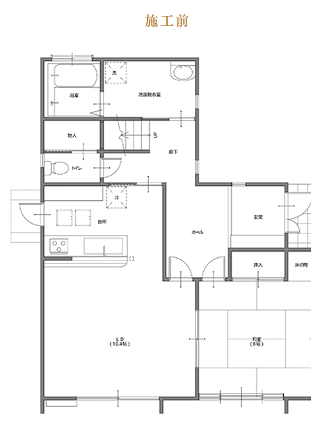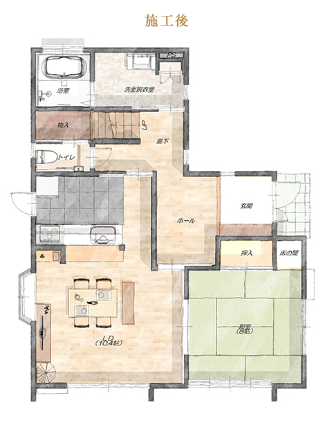 キッチンはアンティーク調の扉にシルバーの取っ手が映え、床には傷に強いフロアタイルを採用。おしゃれで使いやすい空間となりました。リビングダイニング側には吊り戸棚を活かした造作カウンターと収納棚を設け、収納力と「見せる収納」を両立。床は杉柄シートとし、建具やクロスも統一して明るくナチュラルなLDKに仕上げました。
