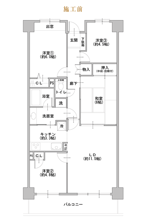 リビングと洋室をつなげて4LDKを3LDKへ変更し、開放感ある広々としたLDKに。上質なカーペットと梁を活かした照明、アクセントクロスが落ち着いた雰囲気を演出します。キッチンは壁をなくし幅2700mmへ拡張し、電動昇降吊り戸棚を設置。ワインレッドのキッチンとソファの色を揃えることで、空間にメリハリが生まれ、LDK全体がぐっと引き締まって見える仕上がりになりました。