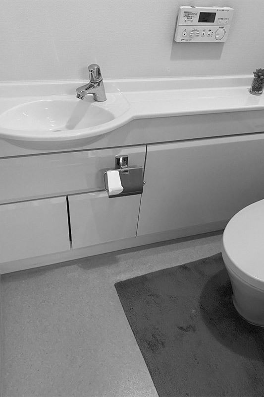 お手入れが簡単なタンクレストイレへ交換し、すっきりと清潔感のある空間に。使いづらかった手洗い下のキャビネットはオープン収納に変更し、使い勝手を改善。さらに、水はねが気になりにくいよう手洗い正面には濃い色のクロスを採用し、清潔感とデザイン性を両立しました。