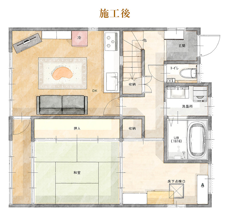 トイレ空間をより衛生的で安心して使えるようにリフォームしました。自動開閉・自動洗浄に加え、使用のたびに便器やノズルを除菌する機能を搭載したタイプを採用。さらに手洗い器には非接触の自動水栓を取り入れ、直接触れずに手洗いができる清潔で快適なトイレへ生まれ変わりました。