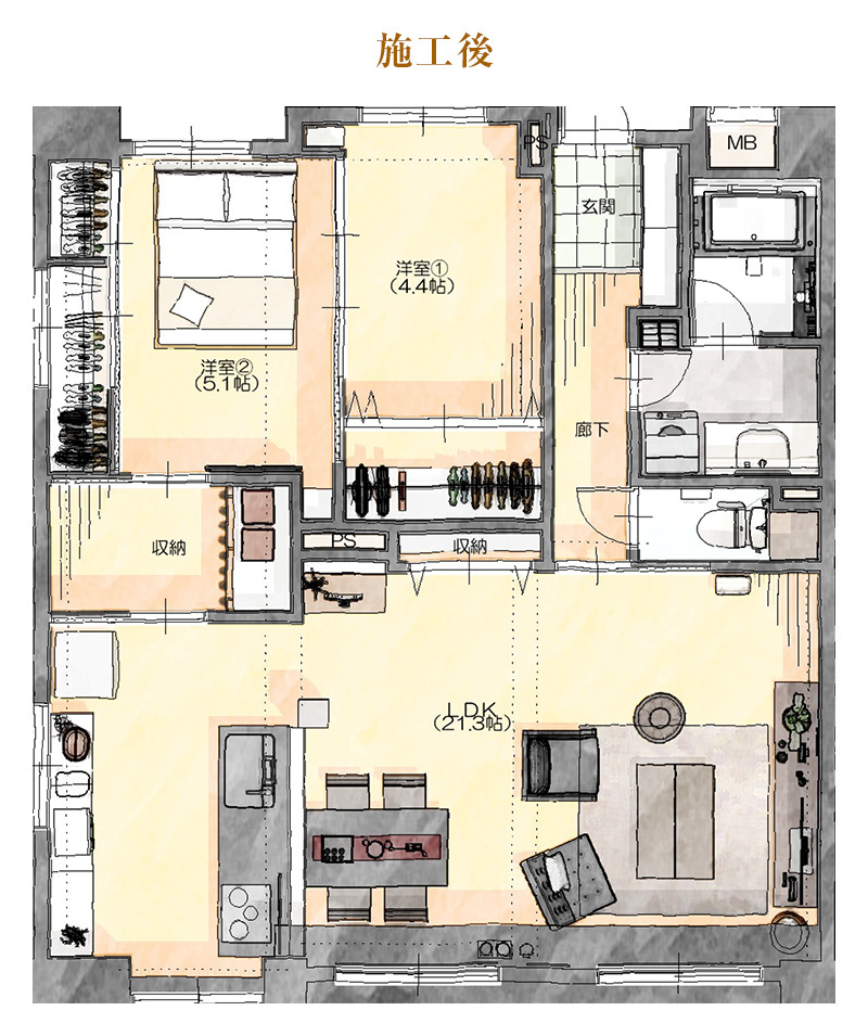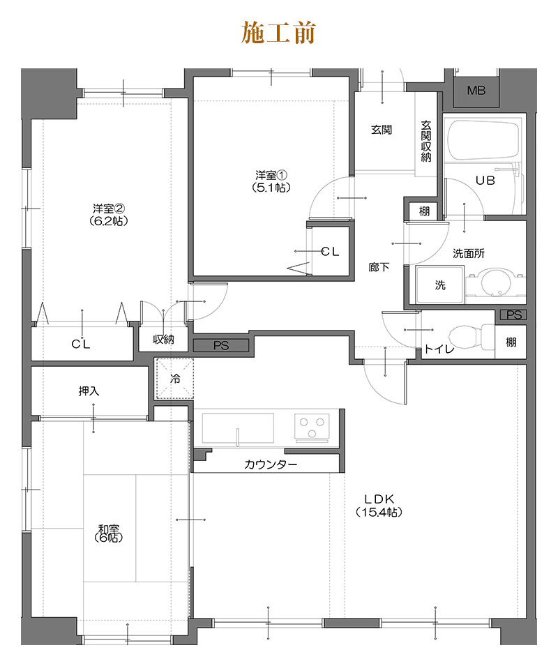 トイレ本体はそのまま活かし、空間がより広く感じられるように整えました。紙巻き器は使用音がリビングに響きにくいよう、反対側の壁へ付け替えています。また、扉も新しいものへ交換し、全体の雰囲気をきれいにまとめました。背面には猫の足跡柄のアクセントクロスを採用し、ほっと癒される可愛らしい空間に仕上がりました。