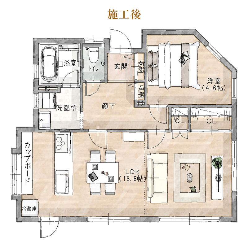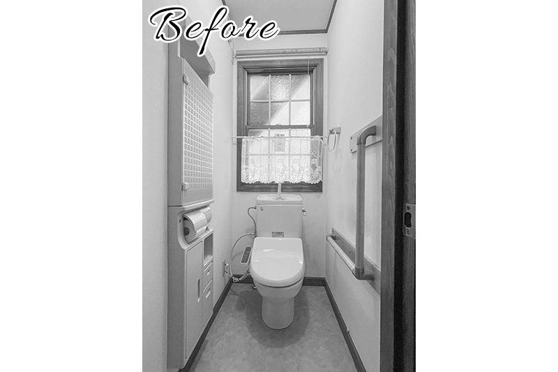 背面の大きな窓が原因で収納が確保できなかったトイレを、背面に新たな壁を設け収納棚を造作することで、生活感を抑えたスッキリとした空間へリフォームしました。収納は正面から見えにくい配置で、トイレ用品もきれいに整理できます。さらにサイド壁にはニッチを造作し、収納力とデザイン性を両立したトイレに生まれ変わりました。