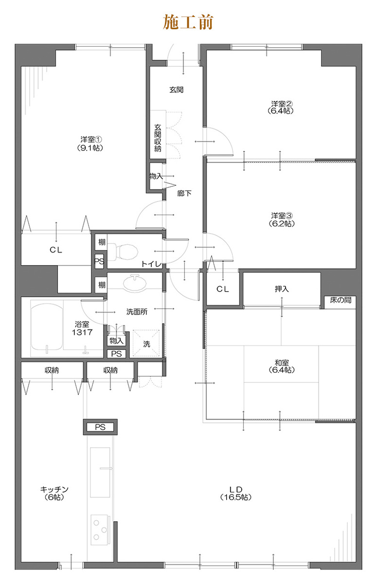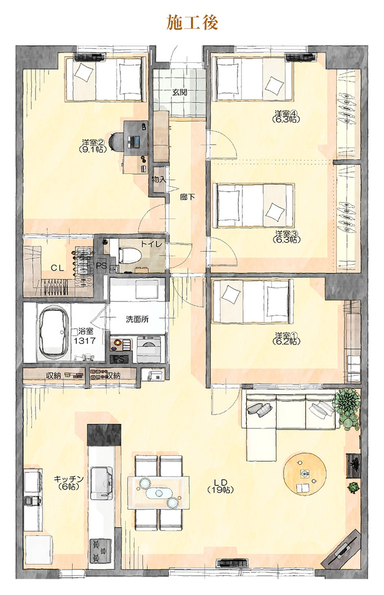 側面の一面にアクセントクロスを採用。落ち着いた空間にさりげない柄を加えることで、華やかさがほどよく感じられる仕上がりになりました。クロスは工事中に旦那様からご提案いただき、相談のうえ急遽変更したものです。「工事中でも相談できて変更できたのが良かった。収納も増えて快適です」と嬉しいお声をいただきました。