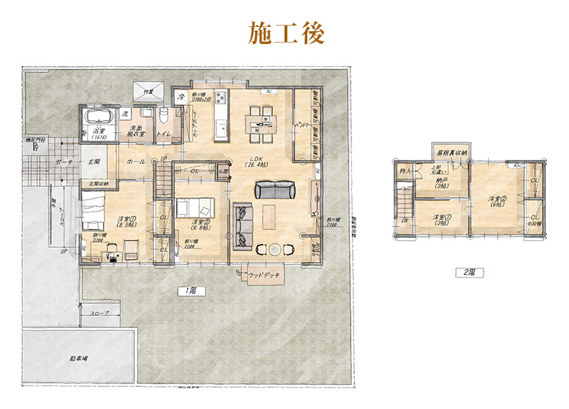 お母様がトイレを使いやすいよう、洋室側へ近づける形で間取りを変更し、トイレと洗面所を入れ替えました。トイレはスペースを広げ、手すりと埋め込み収納を設置して安全性と収納力を向上。扉は開閉しやすい引き戸へ交換し、古かった窓も新しくしました。動線が整い、より安心して使える空間となりました。