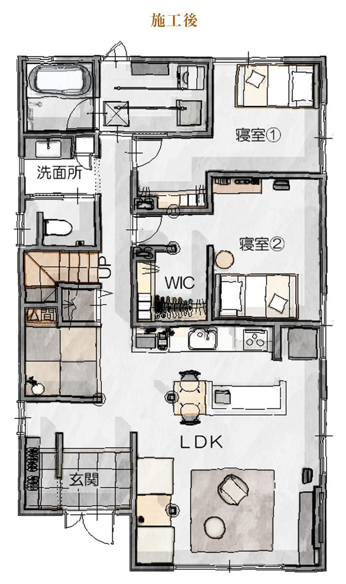 明るすぎる日差しが気になっていたトイレに間仕切りを設置し、やわらかな光が心地よく広がる落ち着いた空間に。さらに背面に収納を新設したことで、生活感を隠しながら必要な物をすっきりと整理できるようになりました。光と収納を整えることで、快適なトイレ空間に生まれ変わりました。