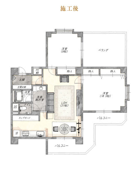 「とにかくおしゃれにしたい」というご希望を形に。マンションでも実現できるガラス扉付きのユニットバスをご提案しました。棚や鏡などはお気に入りブランドのアイテムを採用し、細部までこだわりを反映。鏡やタオル掛け、ランドリーパイプに至るまで統一感のある上質な空間が完成しました。
