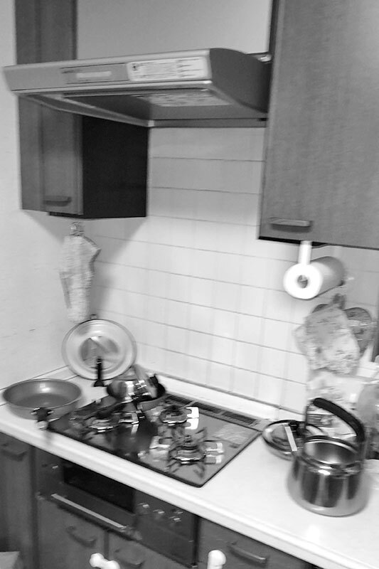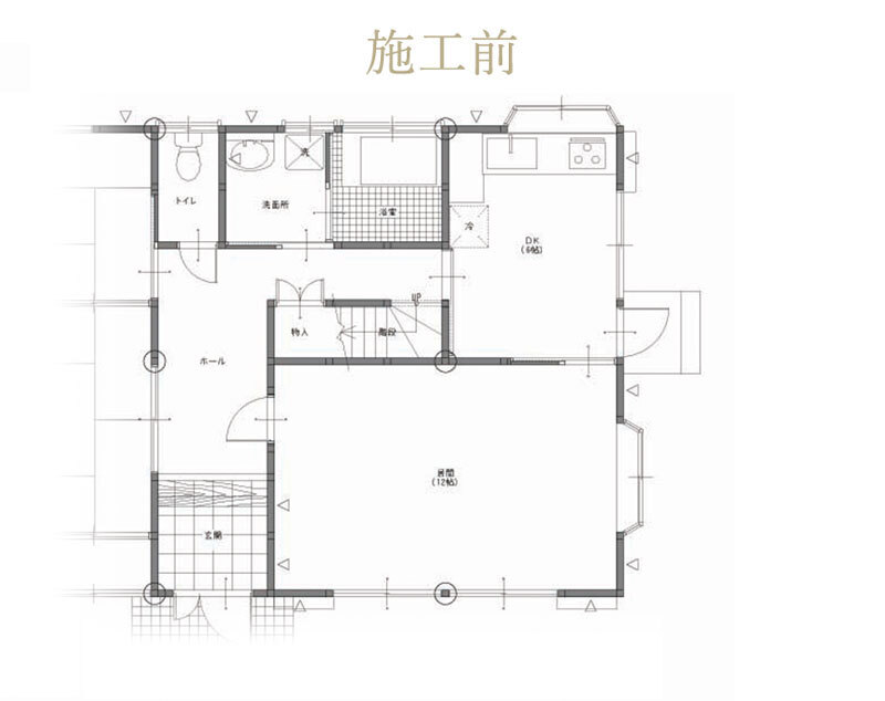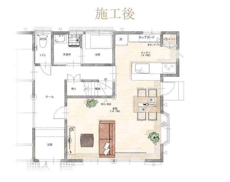 壁向きのL型キッチンは動線が悪く、収納も分散して使いづらい状態でした。間仕切りが空間を分断し閉塞感もあったため、撤去と1.5畳のプチ増築で対面キッチンを新設。手元を隠すカウンターでリビングとの距離を心地よく保ち、冷蔵庫上の収納はキッチン本体と同素材で統一。採光を確保する大きな窓を設け、明るく開放的な空間が完成しました。