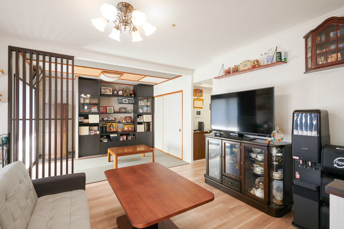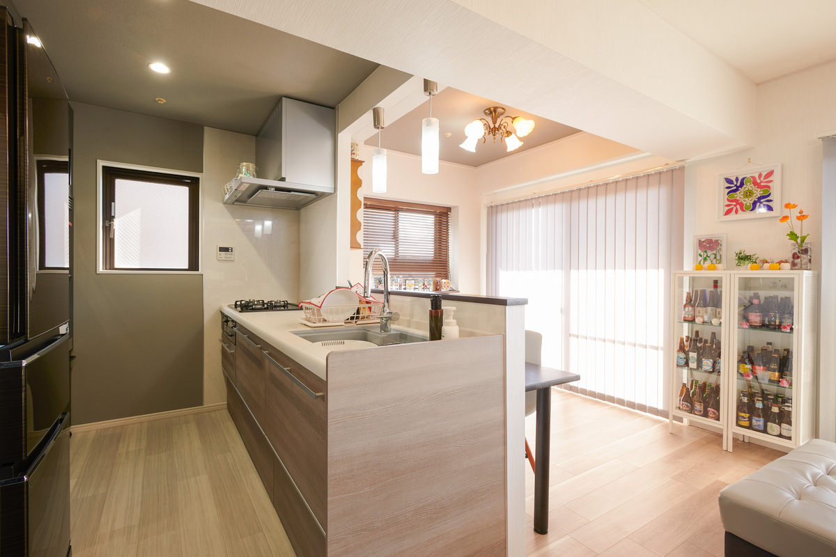 リビングダイニングの壁に飾り棚を設け、趣味のアイテムを飾って楽しめる空間にリフォームしました。ダイニングには大工さんが製作した長い棚を設置し、その他の棚はお施主様がご自身で取り付け。奥様が製作したステンドグラス風のインテリアや趣味のご当地ビール、食器などが並び、暮らしを楽しめるLDKになりました。