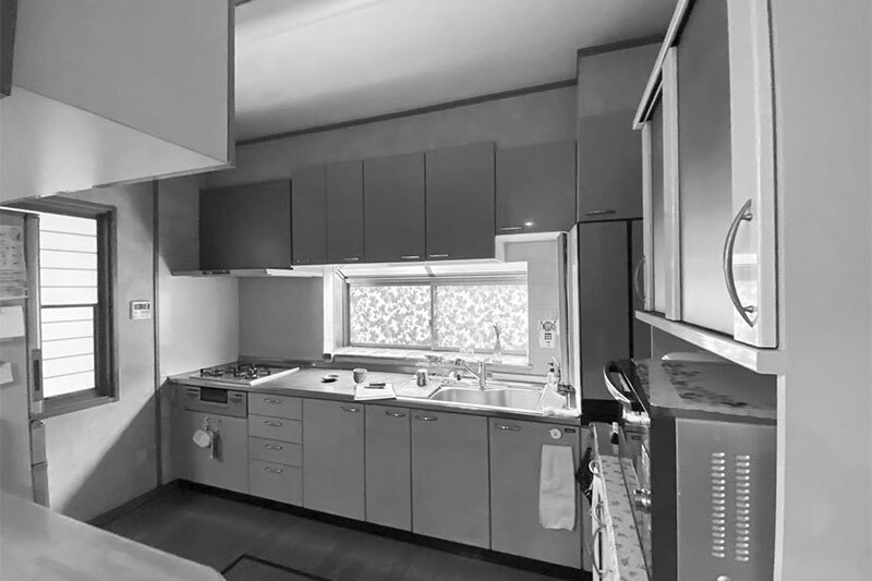 壁付けだったキッチンを対面式に変更し、ご家族と会話を楽しみながら料理できる空間へ。手元が見えないようカウンターを設け、すっきりとした印象に。シンク下にゴミ箱スペース、背面にカップボードを配置して動線もスムーズに。西日対策でサッシを小さくし、出窓を横滑り窓へ変えて採光とお手入れのしやすさを両立しました。