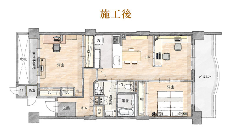 独立型だったキッチンを対面型に変更し、リビングを見渡せる開放的な空間にしました。すっきりとしたデザインと耐久性の高い素材で、見た目と使いやすさを両立。リビングダイニングは「モノを少なく、すっきりとした空間にしたい」というご希望に合わせ、棚板で収納を確保しつつ、インテリアを楽しめる「見せる収納」に仕上げました。