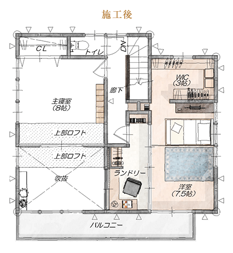 洋室AとBをつなげ、より使いやすい洋室とウォークインクローゼットを新設。吹き抜け側に内窓を設置することで自然光が入り、風が抜ける明るく心地よい空間になりました。間仕切りは光を通す素材を選び、閉塞感を軽減。IKEAの本棚を壁に埋め込むことで見た目もすっきり。収納量をしっかり確保しながら、日々の家事動線が快適になる空間へと生まれ変わりました。