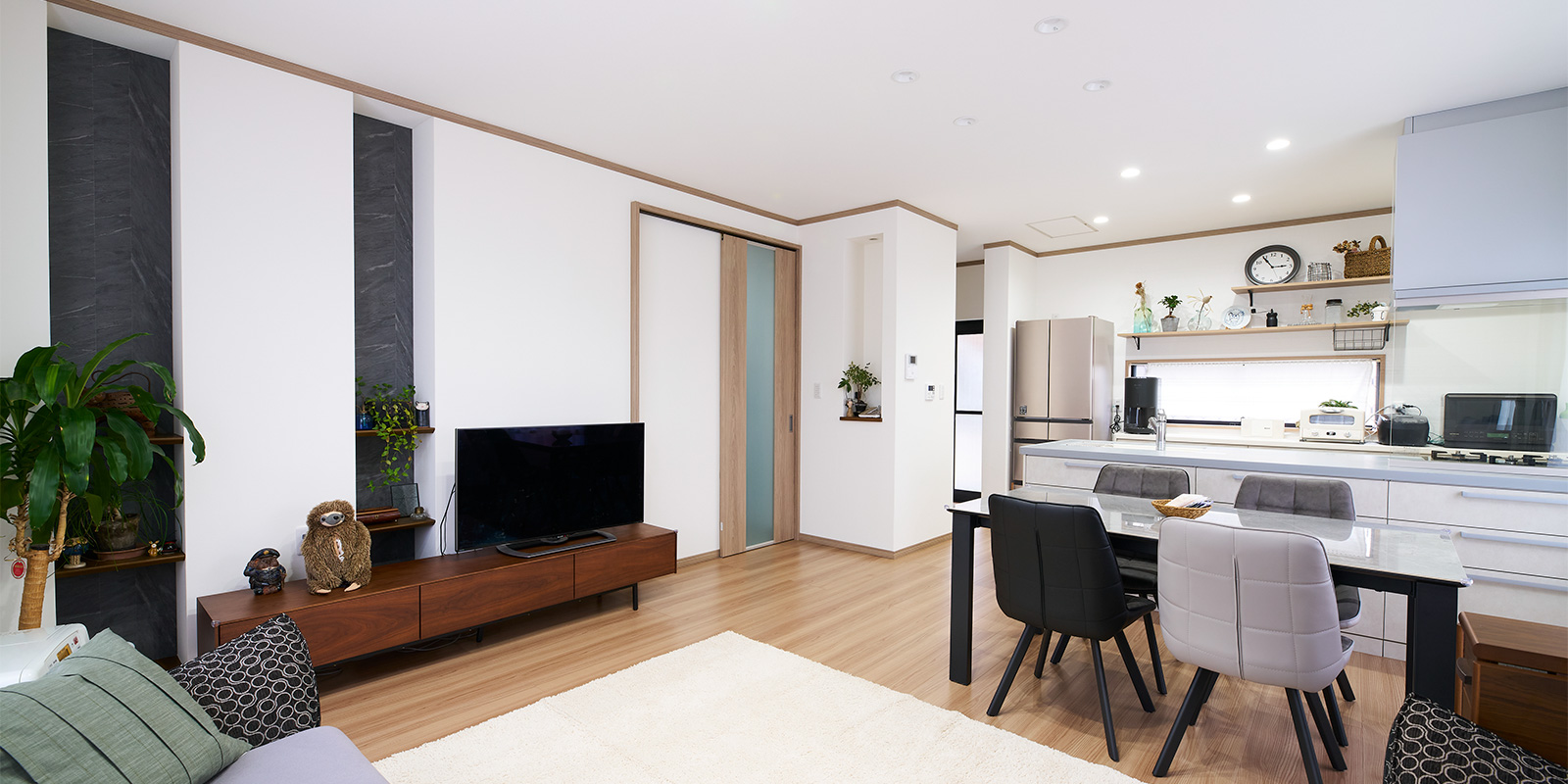 H様はお孫さんのお世話をする機会が多く、見守りながら家事ができるように、対面式キッチンをご希望されました。