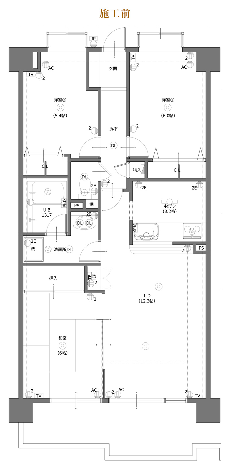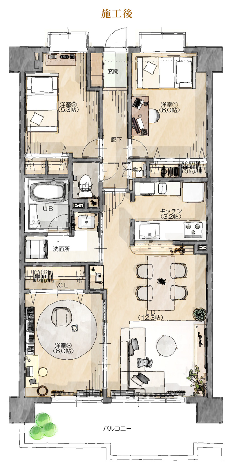 共働きのご夫婦と小学生のお子さまの3人家族をイメージした、3LDKのファミリー向け中古物件をリノベーション。