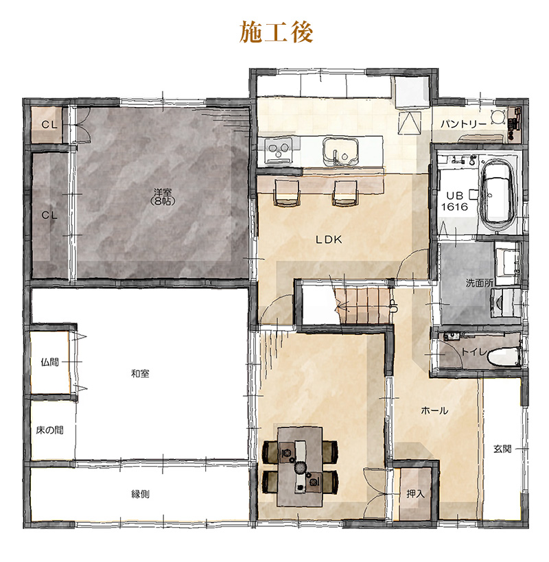 ご提案したプランやパースを大変気に入ってくださり、最終的にフルリノベーションをご依頼いただくことに。
