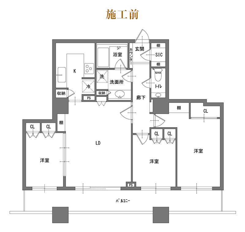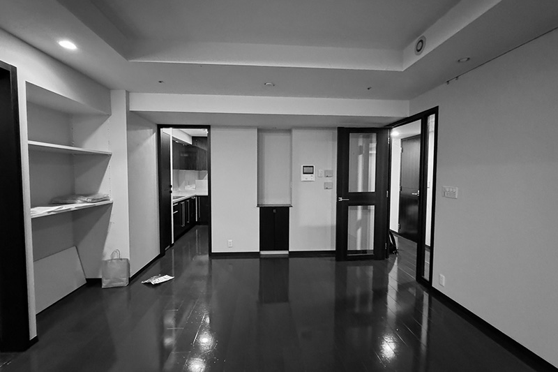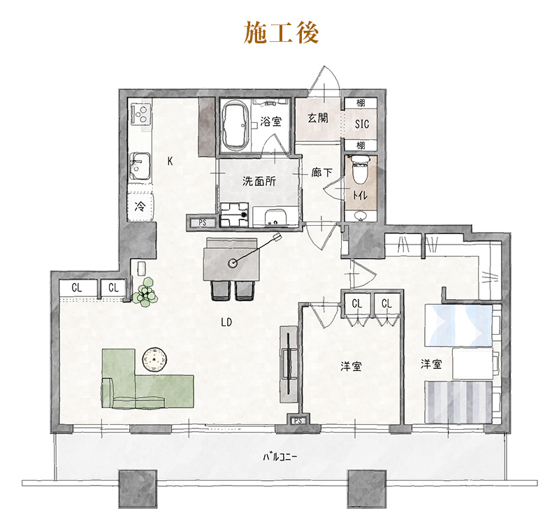 廊下とリビングの扉位置を見直し、隣接する洋室と一体化。動線を整理しながら視線が奥へと抜ける設計とすることで、約20畳の開放的なLDKが生まれました。
