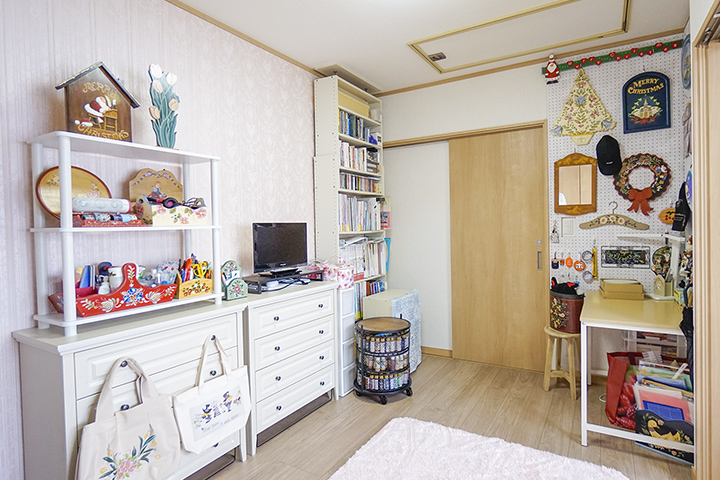 和室だったお部屋をリビングとつながる洋室にして、奥様の趣味スペースや巨大収納スペースを作りました。リビングと洋室の間には三枚引込戸を取り付け、家族の時間とご友人が来た時とで間仕切れる仕組みに。
